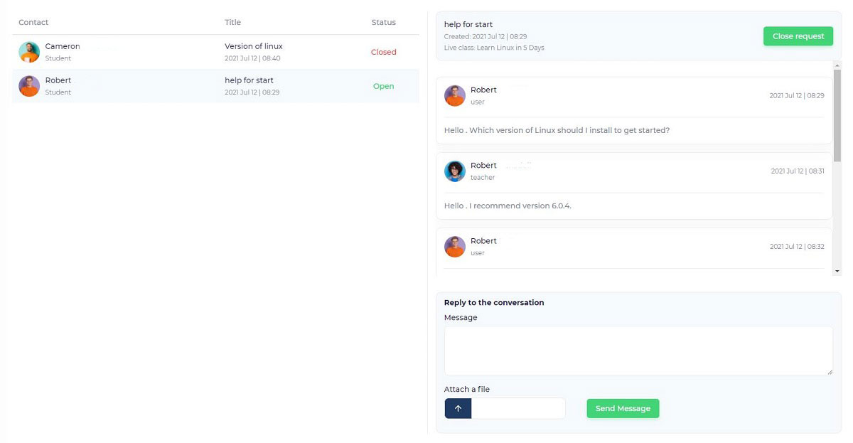 One of the most important features of each LMS system is the course support system. It helps the students and instructors get in touch. If an instructor turns the “Support” option on the course creation process, this option will be accessible for students so they will be able to send support messages through their panel. The course support conversation is between the student and the instructor but the admin account also can check it through the admin panel. The admin can delete a conversation and reply to it by clicking on the related icons in the “Controls” column in the class support messages list.