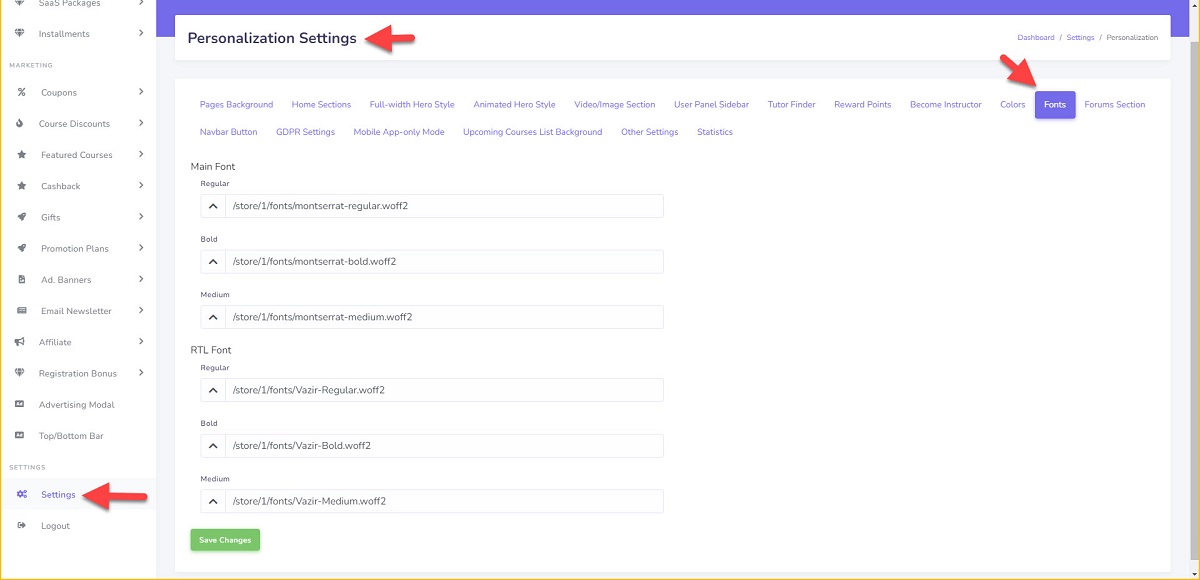 You can change fonts from the “Admin Panel/ Settings/ Personalization/ Fonts” tab.
