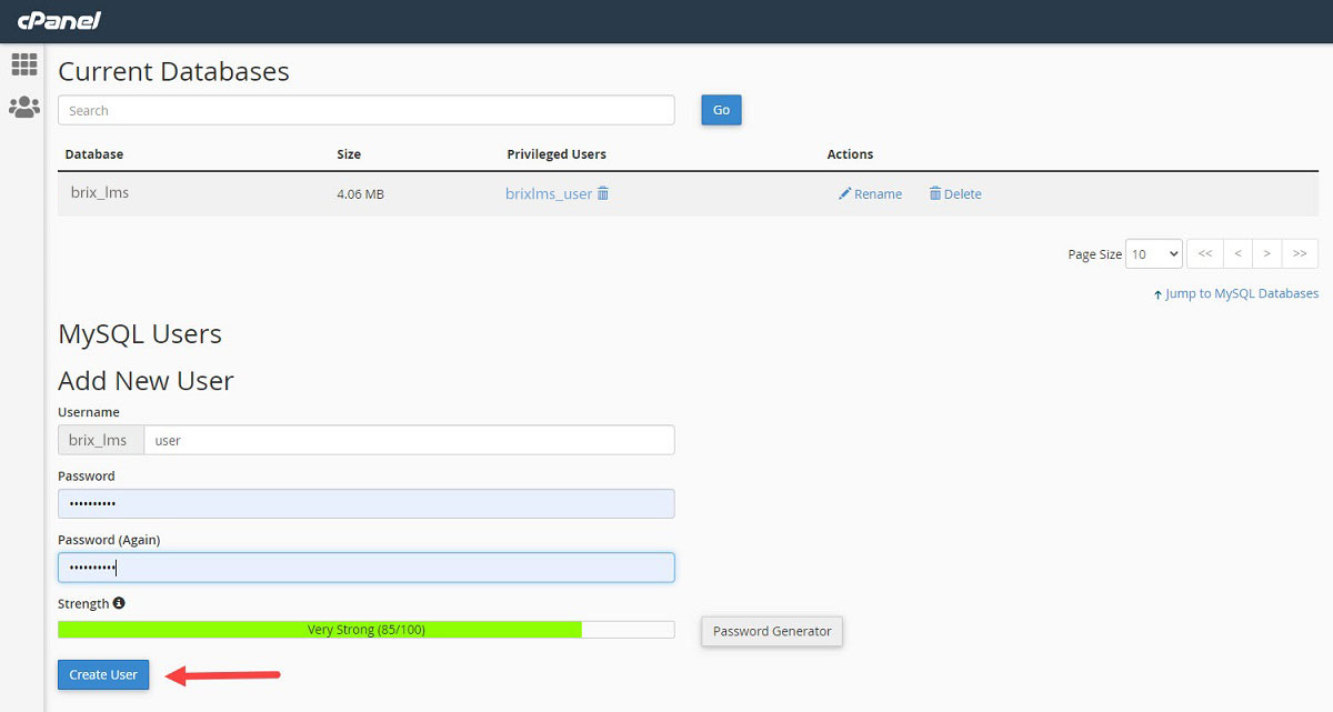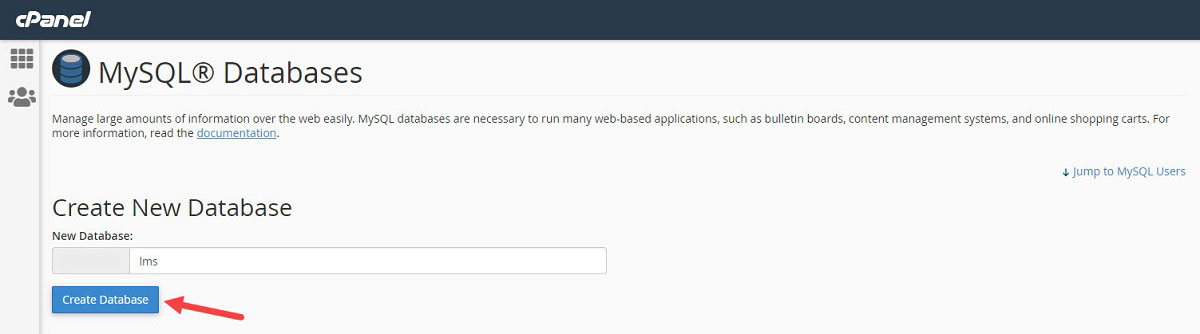 Go to “MySQL Databases” and create a database according to the following screenshot: