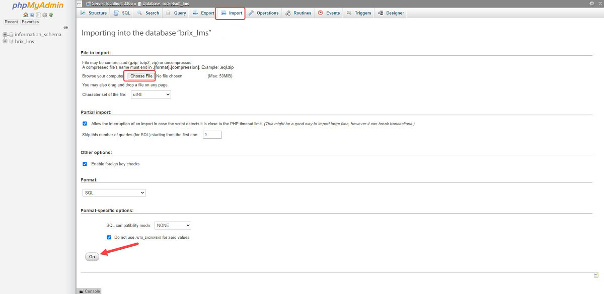 Go to phpMyAdmin and select the created database from the side menu and click on the “Import” tab.
