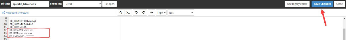 Go to the cPanel file manager and navigate to the public_html folder. Edit the “.env” file and put the database information according to the following screenshot and save changes.