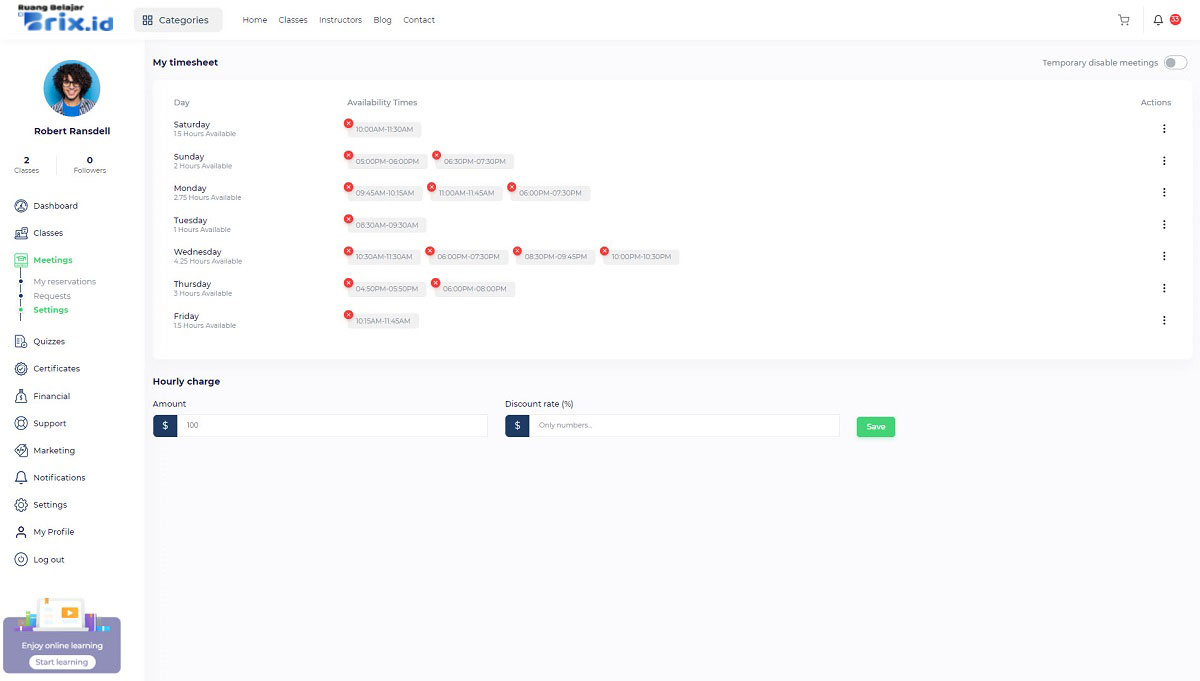 Conducting and selling live meetings is available for instructors and organizations. If you want to provide live meetings go to “Instructor panel/ Meetings/ Settings” and define your available times for a week so when you define at least one hour in a week, you will be displayed in the instructors list that is available for meetings.