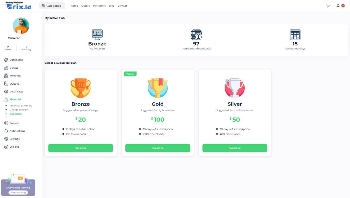 Subscribe plans will be displayed on the home page or “User Panel/ Financial/ Subscribe”.