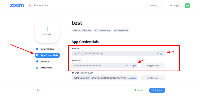 - After you fill in the name above, you will be redirected to the App credentials section, here copy the Client ID,Client Secret and Account ID using the copy link and paste these values inside the instructor Zoom settings page.